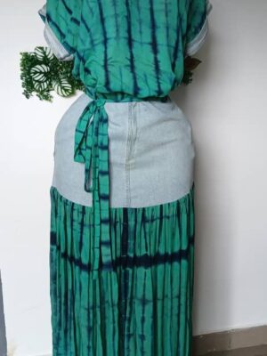 Sublimez votre style avec cet ensemble deux pièces unique, parfait mélange entre tradition et modernité. Composé d’un haut fluide en tissu wax teint à la main et d’une jupe jean wax agrémentée d’un panneau plissé en wax assorti, cet ensemble allie confort, élégance et originalité. La ceinture en wax permet de marquer la taille pour une silhouette harmonieuse et féminine.